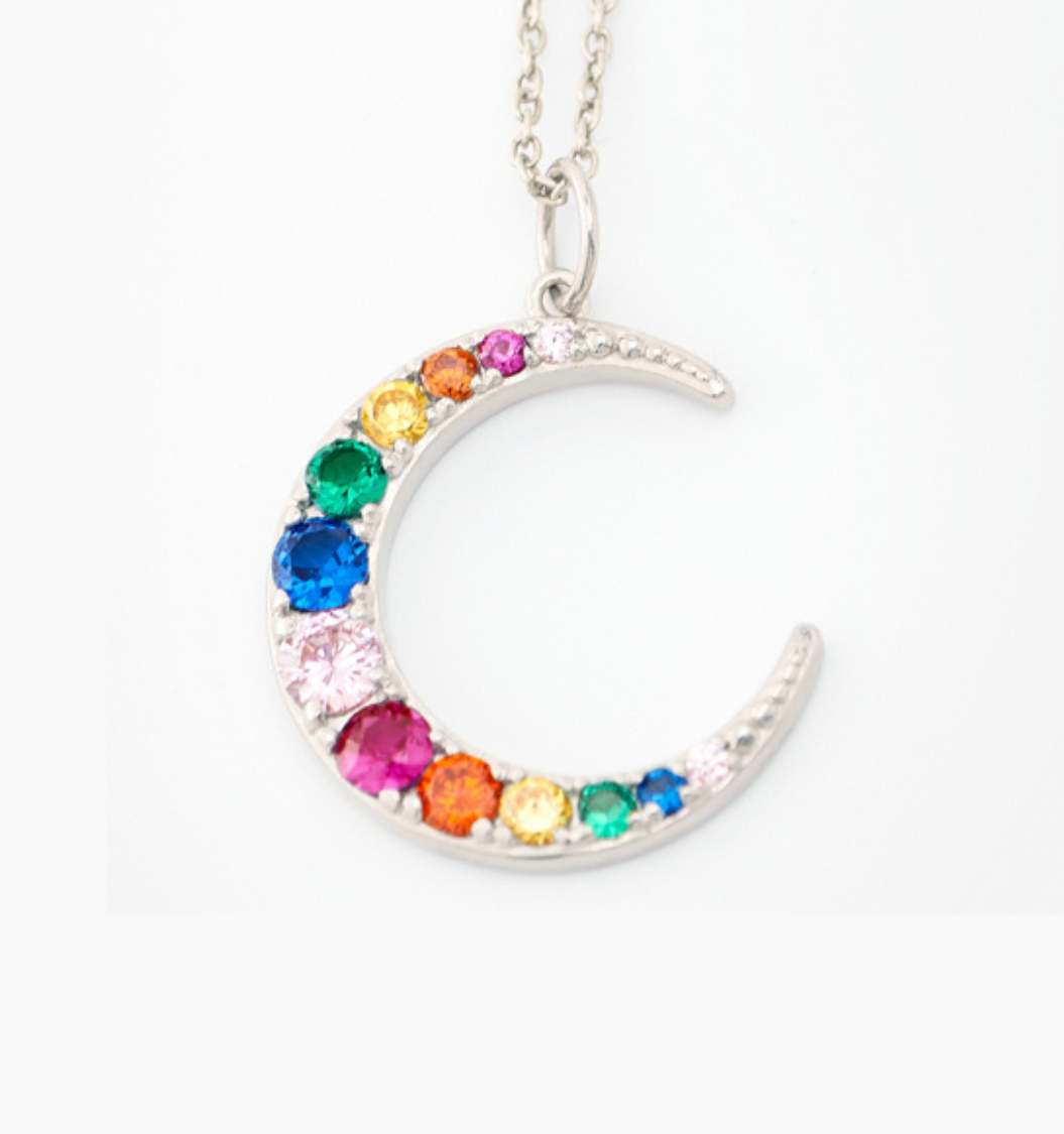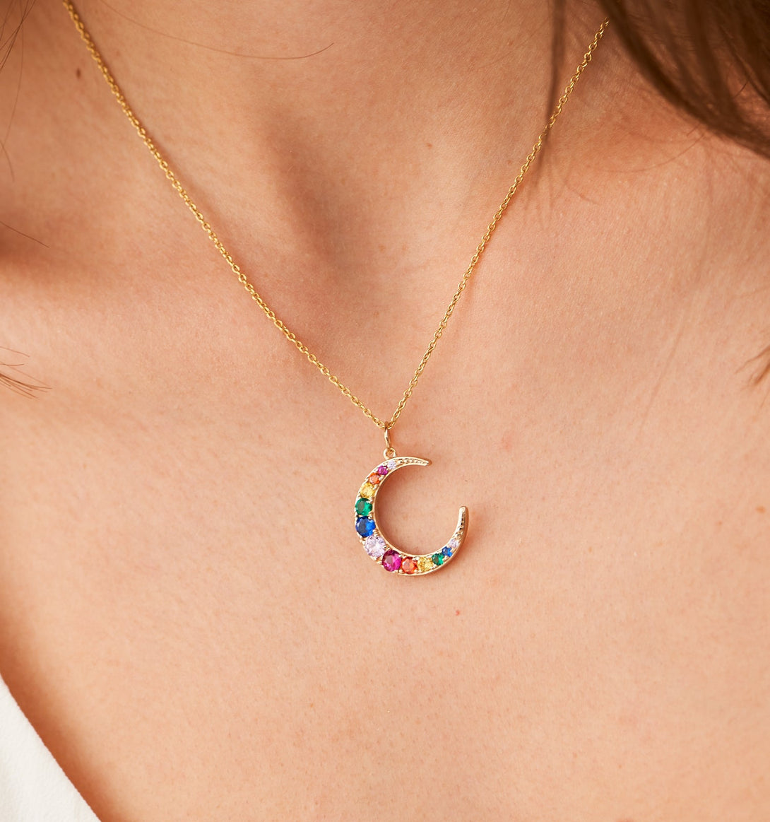 Wear this gorgeous Moon Necklace as powerful symbol as a reminder of your strength, enlightenment, and connection to the sky. This cute piece features a crescent moon nestled amidst a radiant burst of CZ stones, each one shimmering in a vibrant rainbow hue. Striking and playful, this ring brings together the beauty of the moon and the joy of a rainbow.